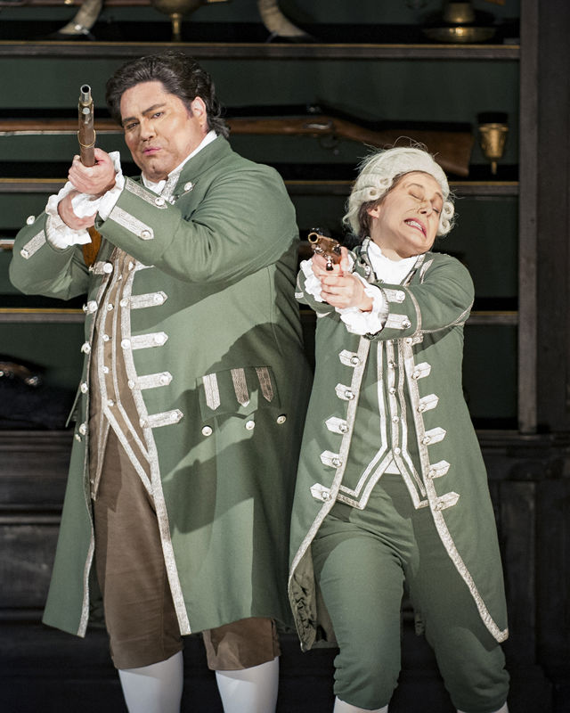 The Countess is heartbroken by her husband’s repeated infidelities. As Susanna dresses the Countess for the day, Figaro arrives to update the ladies on his scheme. He has sent the Count an anonymous note telling him that the Countess is expecting a lover while he is out hunting. Figaro hopes to keep the Count embroiled in this ruse to deflect his attention from Marcellina’s troublesome claim. Figaro also asks Susanna to arrange a rendezvous with the Count later on that evening in the garden. He plans for Cherubino, dressed as a girl, to go in Susanna’s place. The Count will be humiliated and forced to mend his ways. As Rosina and Susanna begin to disguise Cherubino, Susanna leaves the room for a moment. The Count arrives in a jealous fury, having read the anonymous note. He knocks on the bedroom door and finds it locked. A terrified Cherubino locks himself in the closet while the flustered Countess then unlocks her door for the Count. Susanna re-enters, unnoticed. The Countess refuses to unlock the closet, so the Count leaves, taking the Countess with him, in search of tools to break the lock. Susanna helps the page escape through the window, and then she hides in the closet, surprising both the Count and Countess when they find her there. Figaro arrives and tries to get everyone to come to the wedding festivities. When Antonio the gardener enters and claims someone has jumped out of the window, Figaro takes the blame. Marcellina bursts in with the notary Don Curzio, Bartolo and Basilio and demands her case against Figaro be heard.